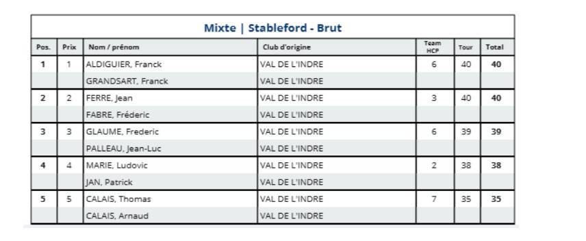 En brut c'est la paire F. ALDIGUIER - F. GRANDSART qui s'impose, tandis que le net est remporté par le tandem F. GLAUME-JL PALLEAU